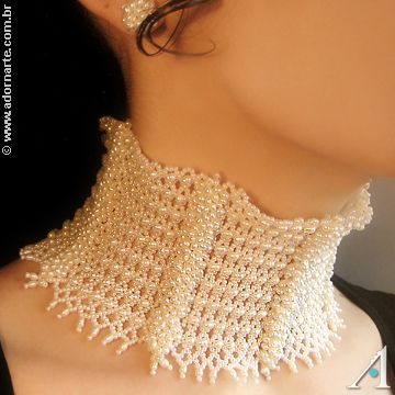 Influência vitoriana, interpretação do século XXI: o clássico colar de pérolas é levado ao limite da ousadia nesta luxuosa gargantilha lembrando um espartilho, rebordada de pérolas de água doce sobre uma malha de miçangas peroladas japonesas. Um engenhoso fechamento anatômico permite que o colar se adapte ao pescoço sem aperto ou desconforto. Sob medida.